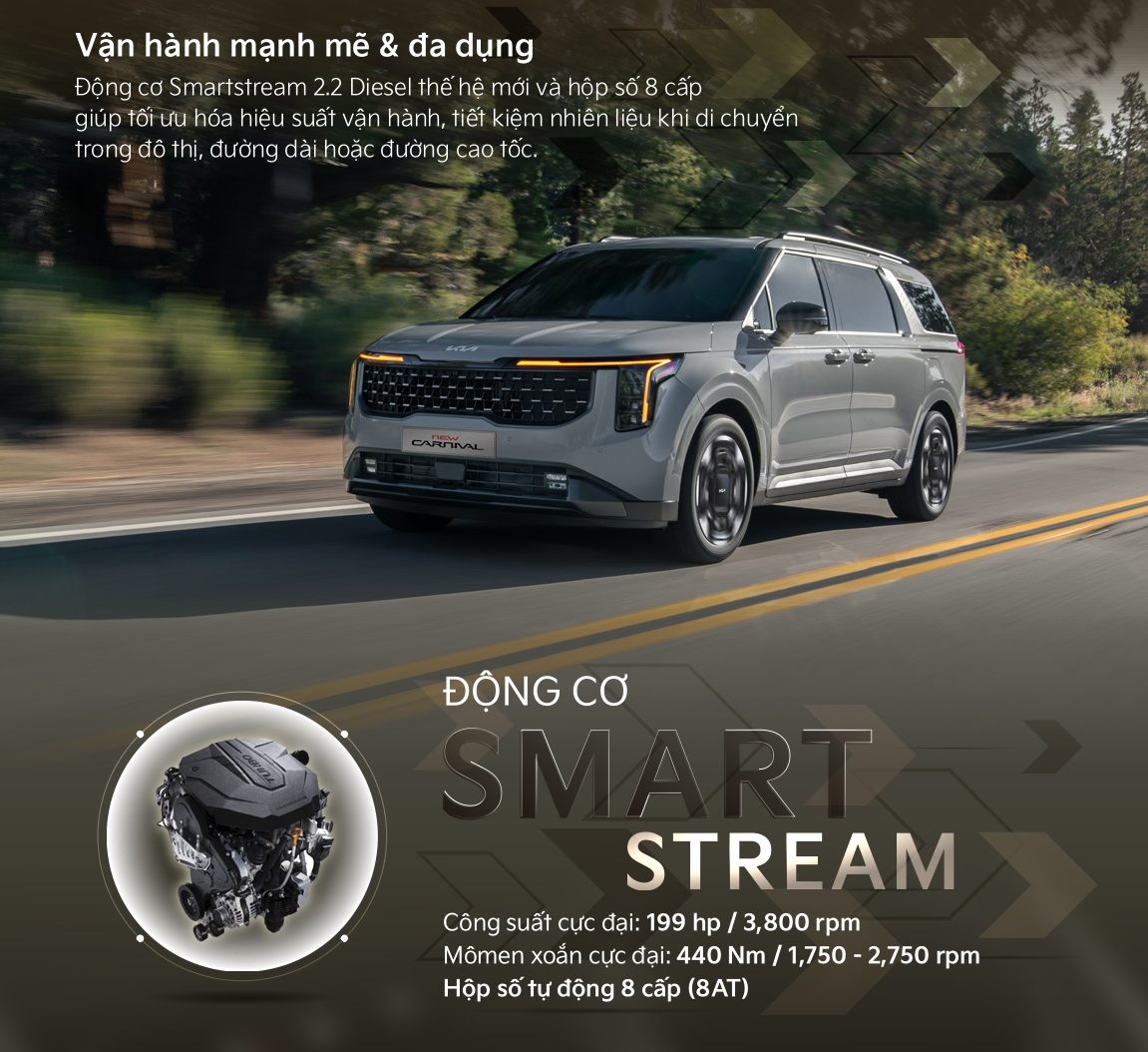 Kia New Carnival nâng cao tính đa dụng với tùy chọn động cơ Smartstream 1.6 Turbo Hybrid mới cho khả năng vận hành mạnh mẽ, tiết kiệm nhiên liệu (~ 4.95 lít/ 100km).