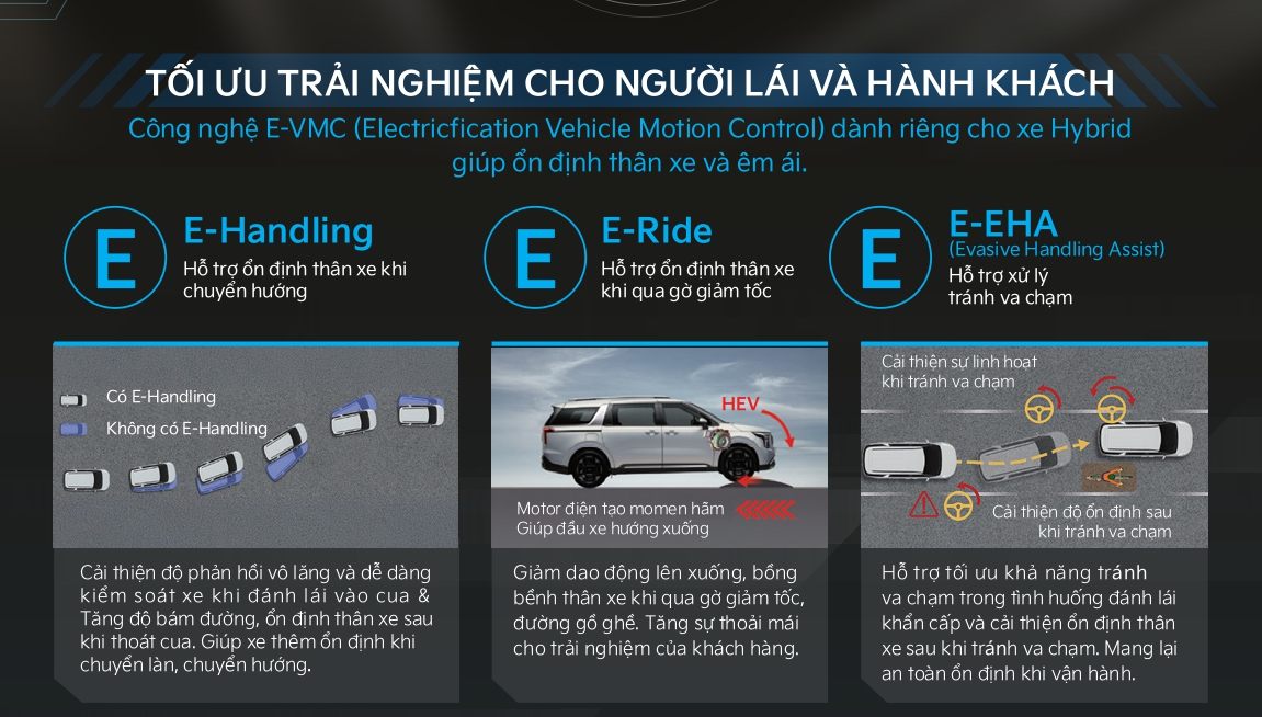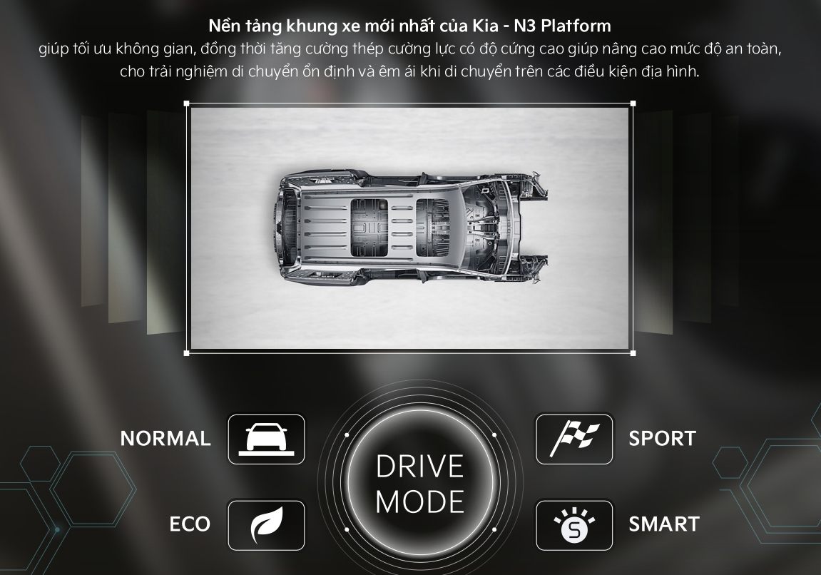 KIA Carnival Hybrid 2025 được xây dựng trên nền tảng khung gầm N3, trên Carnival đã có cải tiến ở hệ thống treo. Hệ thống treo mới cải tiến với treo trước McPherson được tăng chiều dài cao su giảm xóc thêm 5mm giúp giảm lắc ngang khi qua gờ giảm tốc, đồng thời tăng chiều dài bộ phận giảm chấn bên trong phuộc thêm 1 bước (~12.8mm) giúp nâng cao độ ổn định của xe.