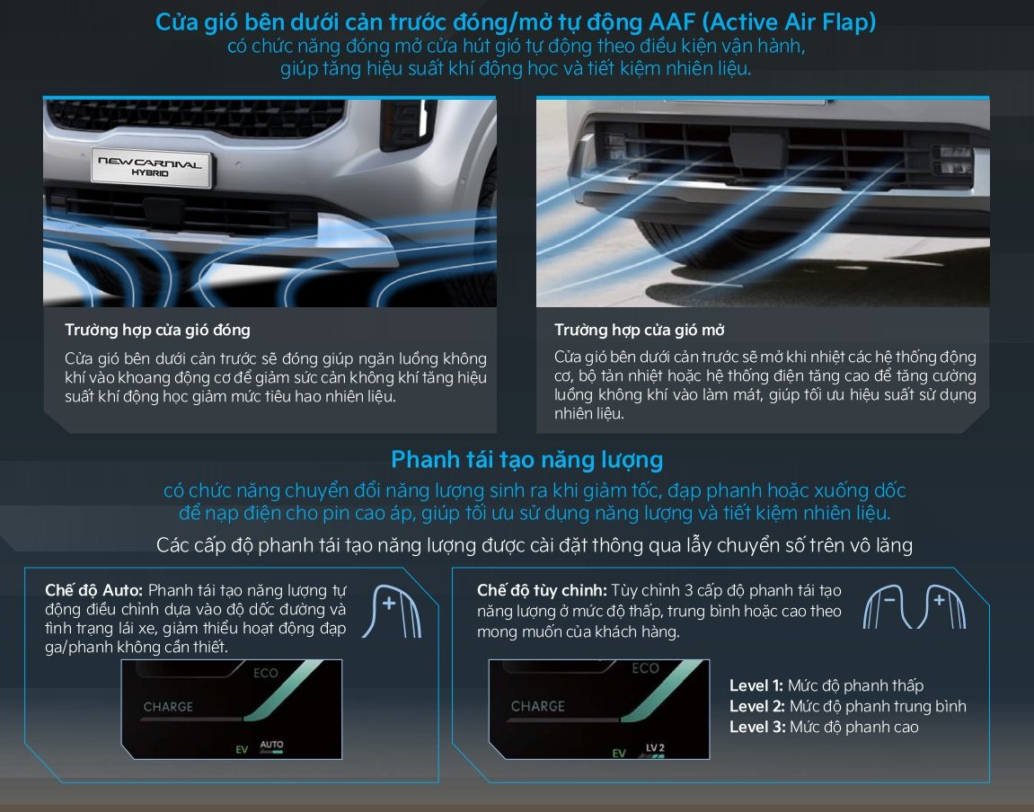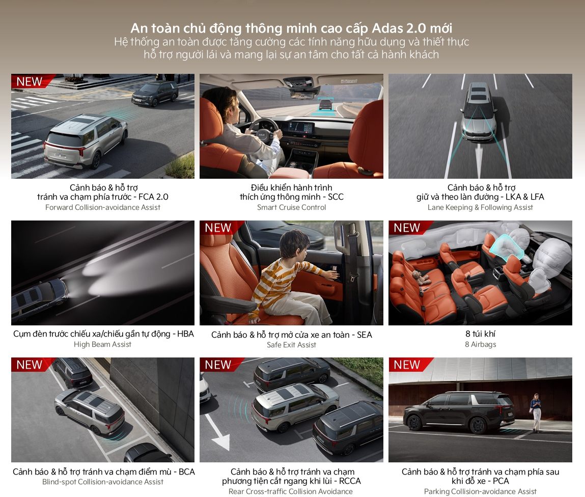 KIA Carnival Hybrid 2025 được trang bị hệ thống hỗ trợ lái xe an toàn mới (ADAS 2.0, ADAS - Advanced Driver Assistance Systems). Hệ thống cao cấp này được trang bị từ phiên bản Premium trở lên.