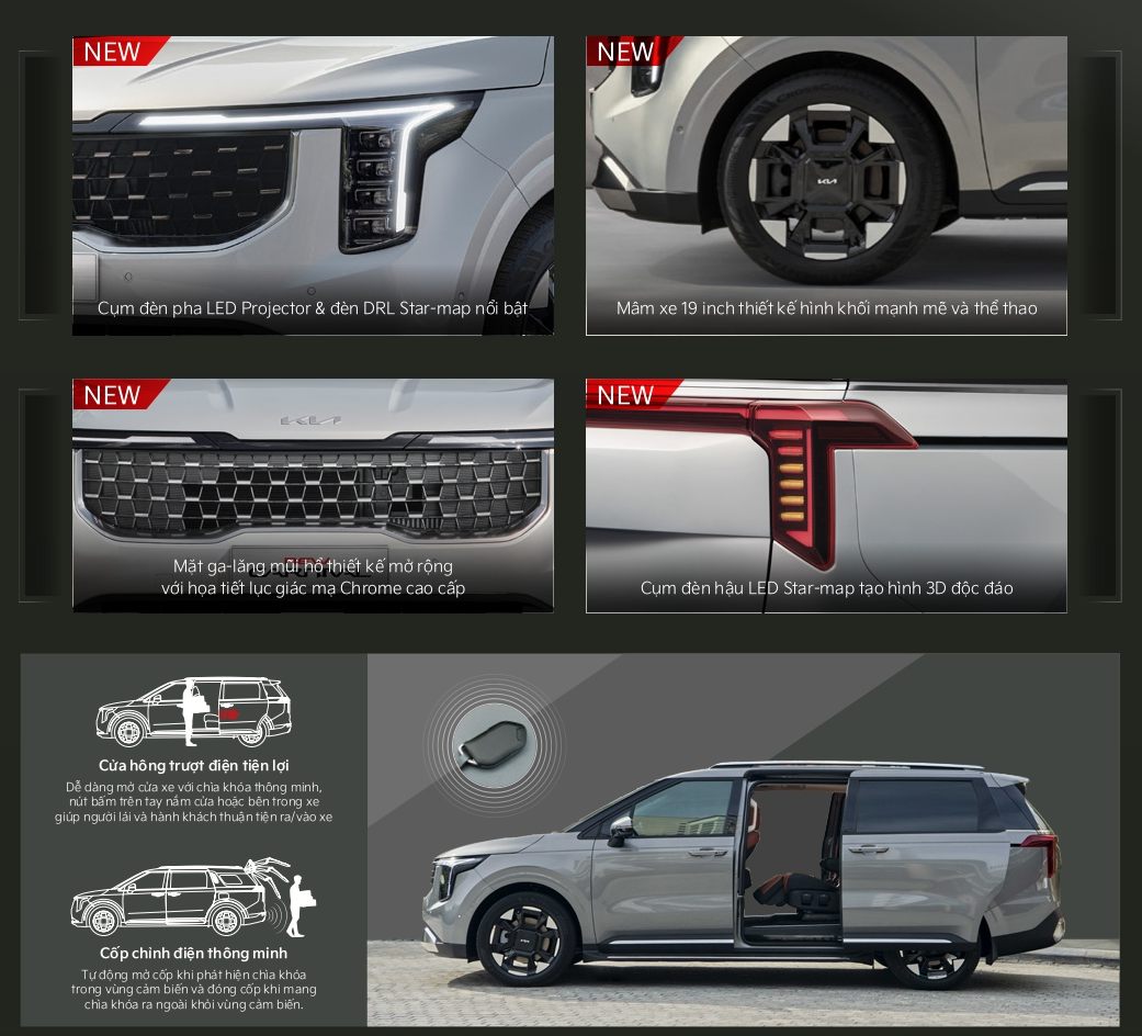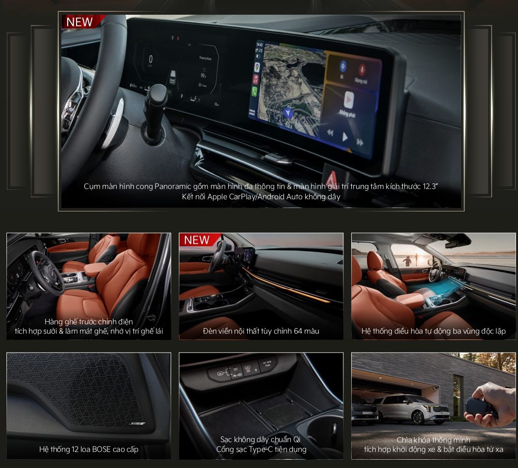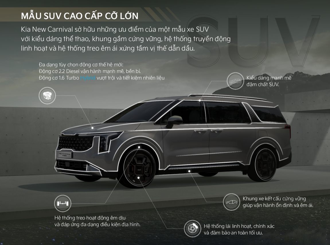 Tiếp nối thành công của Kia Carnival với vị thế dẫn đầu phân khúc SUV cỡ lớn cao cấp tại Việt Nam, New Carnival hội tụ tinh hoa thương hiệu với những nâng cấp đáng giá và mang tính tiên phong trong phân khúc và tầm giá, nổi bật với kiểu dáng mạnh mẽ & sang trọng ứng dụng ngôn ngữ thiết kế mới, khả năng vận hành đa dụng cùng hiệu suất tối ưu, nội thất hiện đại với tiện nghi cao cấp hàng đầu, mang lại trải nghiệm đẳng cấp cho khách hàng.