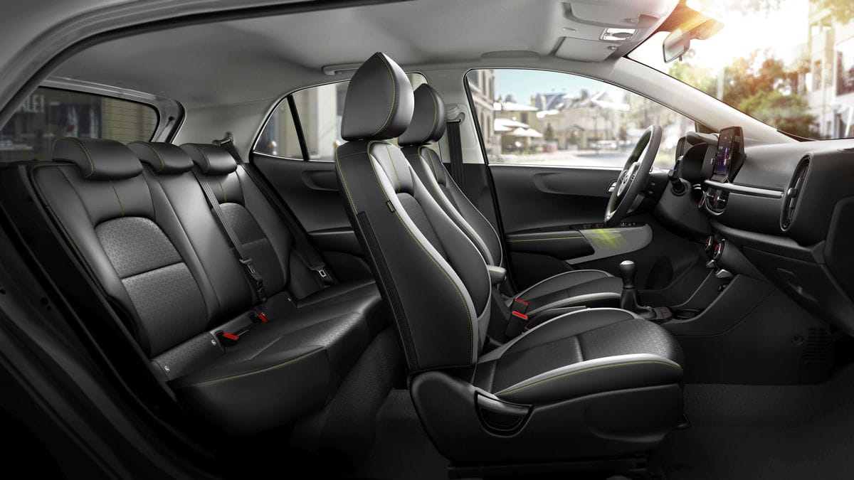 Ghế ngồi trên Kia Morning mới đều được bọc da, riêng bản GT-Line có thêm đường viền và chỉ khâu màu đỏ. Trong khi bản X-Line sử dụng chỉ khâu màu xanh lá. Tất cả các phiên bản đều trang bị ghế chỉnh tay 6 hướng.